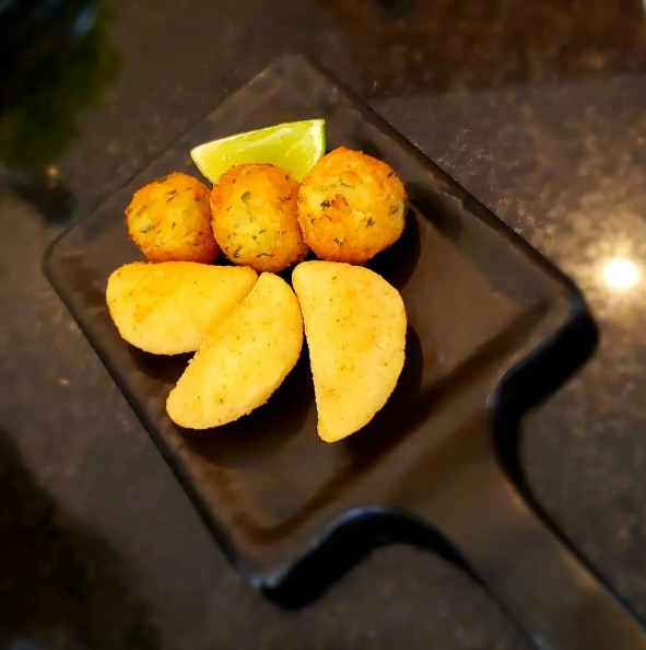 Bolinho de bacalhau, rissole de camarão, tempura com camarões médios, queijo de coalho com melaço de cana, linguicinha artesanal de azeitona com pão de alho da casa.